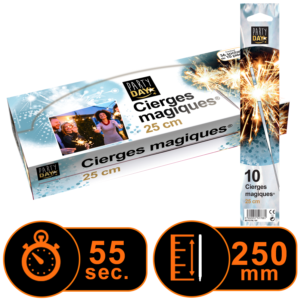 Vendu directement en boite, ce cierge magique de 25 cm est parfait pour les boites de nuit et les mariages.