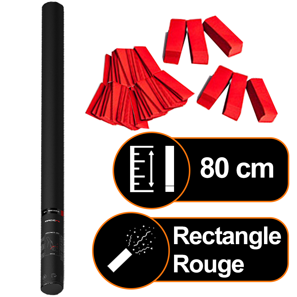 Uniquement du rouge, dans un canon de 80 cm de frisson, propulse super haut des confettis pour maximiser la durée de la retombé et offrir une véritable pluie de confettis comme à la tv à vos clients !