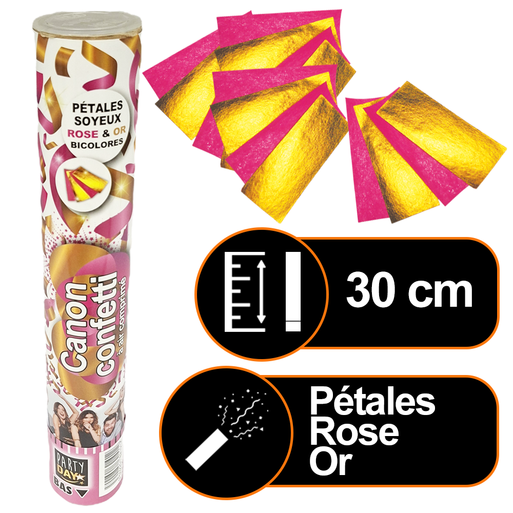 Le canon à confettis pétales soyeux rose & or bicolores 30 cm Pyragric est un produit festif à forte rotation, idéal pour les magasins de fête, boutiques d’artifices et revendeurs événementiels.