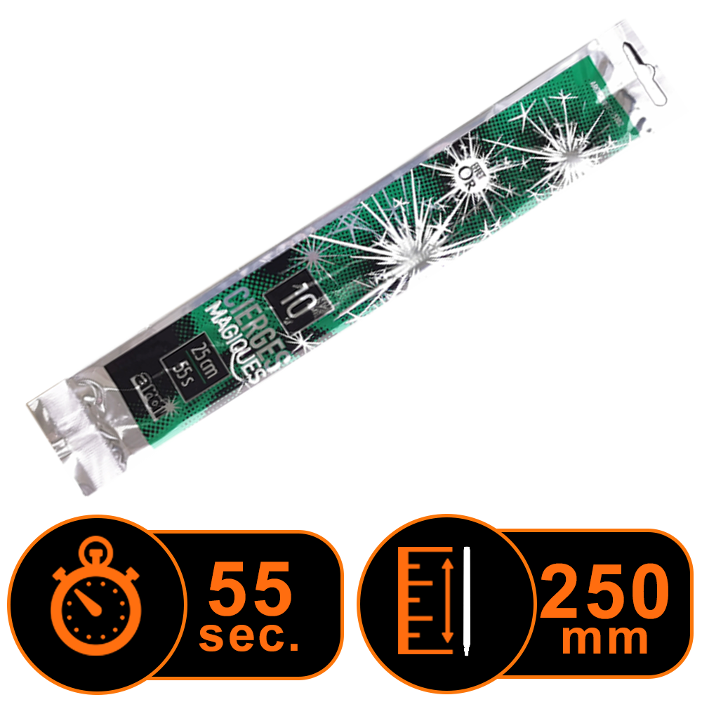 Le compromis idéal entre prix et durée, le 25 cm est un petit bâton d’étincelles très utilisé dans les soirées et autres animations festives estivales et hivernales.