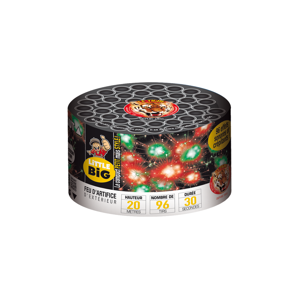 Le compact LITTLE BIG TONY de la marque Le Tigre® est un produit particulièrement intéressant pour les professionnels de l’artifice souhaitant proposer un compact dynamique et accessible à leur clientèle. Avec ses 96 départs multicolores et une durée d’environ 40 secondes, il offre un spectacle visuel efficace dans un format compact qui plaît beaucoup aux particuliers.