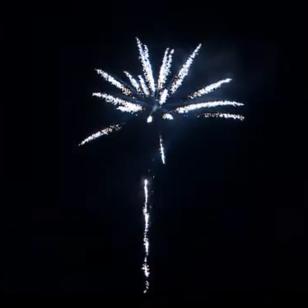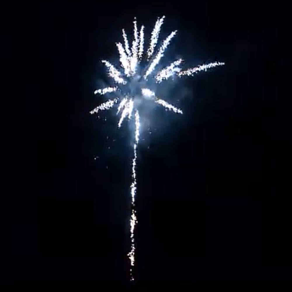 En tir, la différence est tout aussi nette. Les comètes argent montent avec plus d’intensité et ouvrent en énormes palmiers argent qui couvrent largement le ciel. Les éclats métalliques sont plus denses, plus brillants, plus structurés. Le calibre 30 mm permet une hauteur et une ampleur que les compacts classiques ne peuvent pas atteindre.