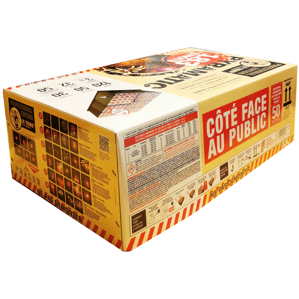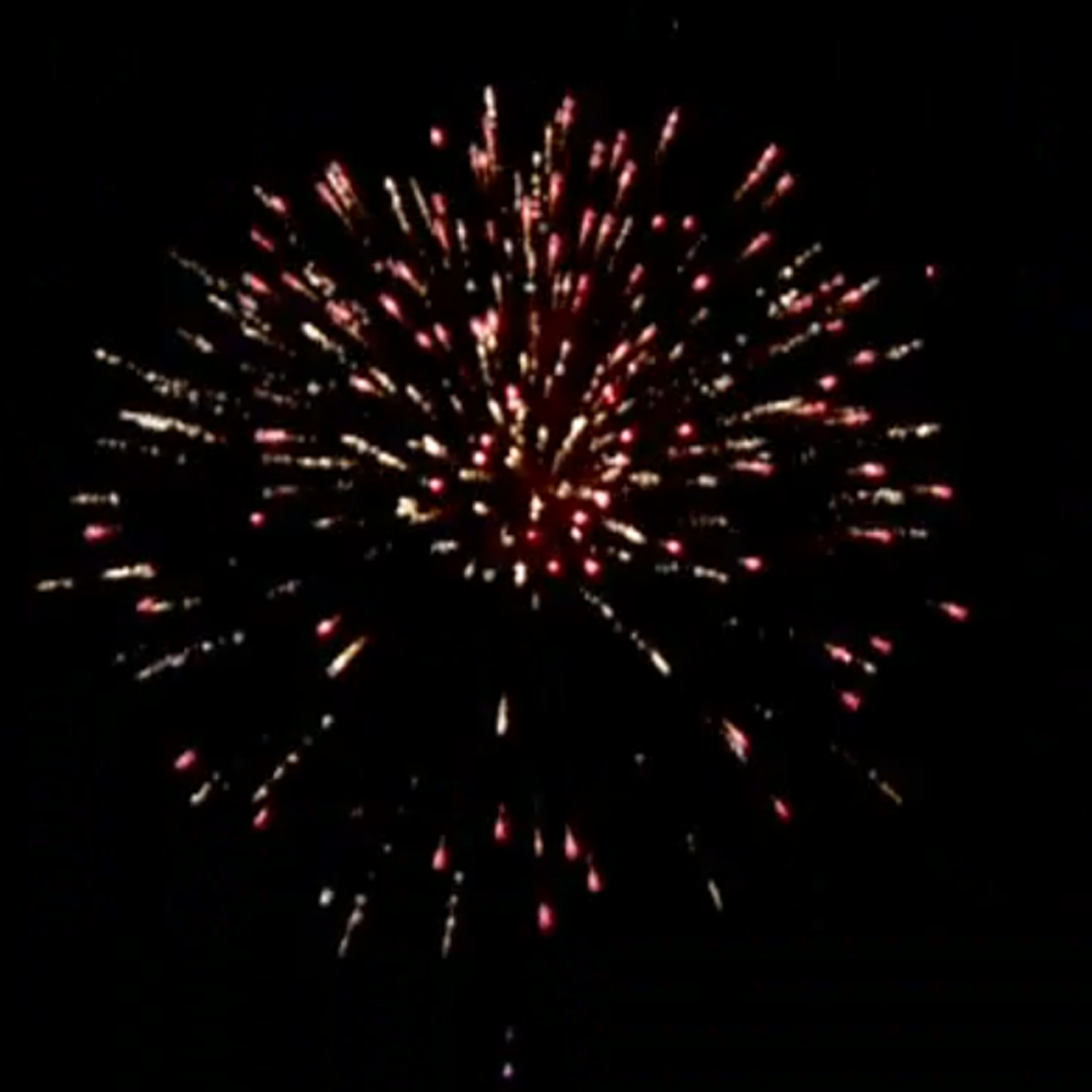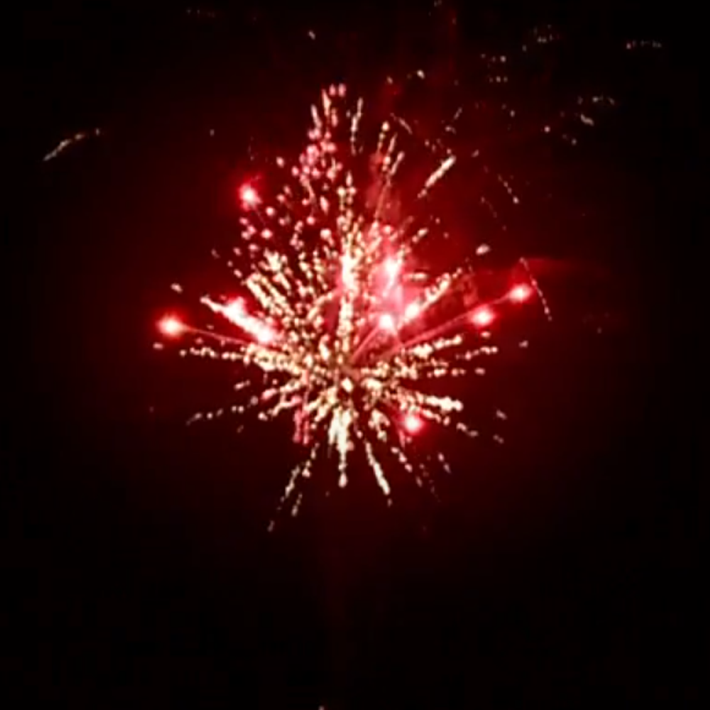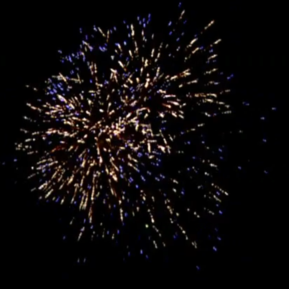 Traînées argent à explosions orange. Trainées orange à explosions rouges. Effets variés de couleur bleu, blanc, rouge, jaune, vert, orange, violet avec bombettes assorties.