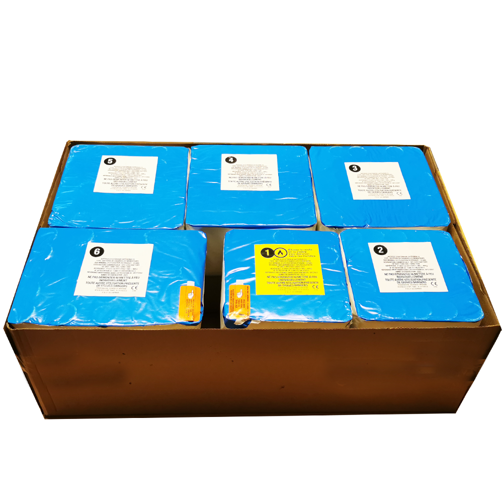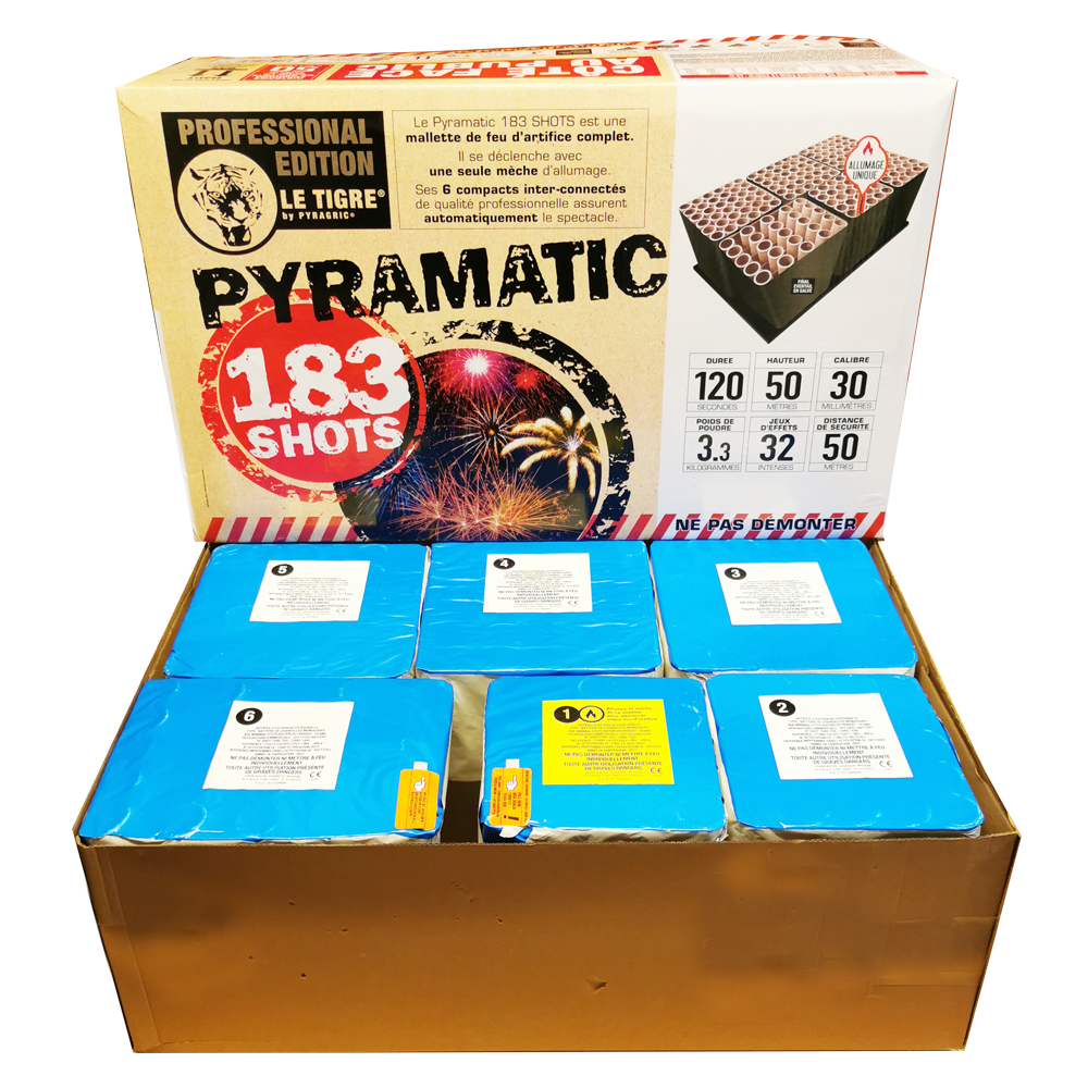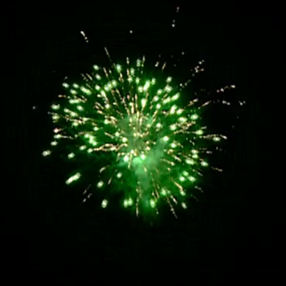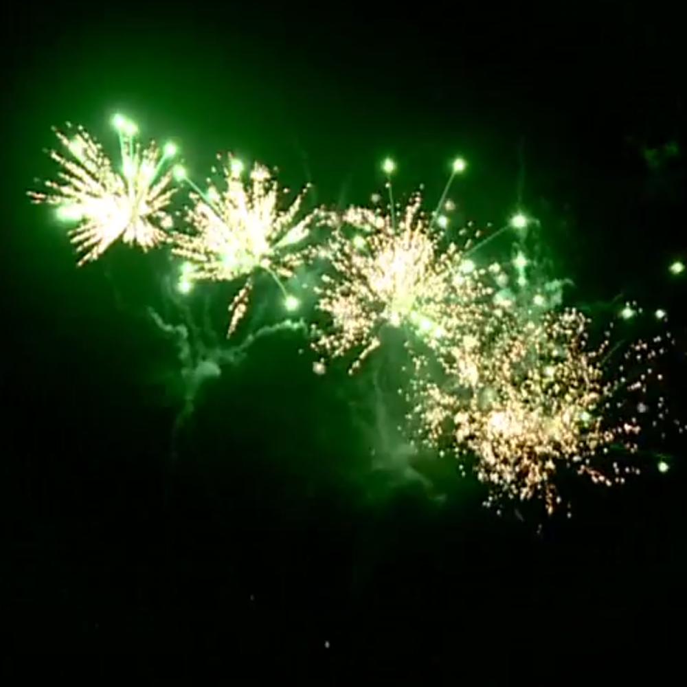 Traînées argent à explosions orange. Trainées orange à explosions rouges. Effets variés de couleur bleu, blanc, rouge, jaune, vert, orange, violet avec bombettes assorties.