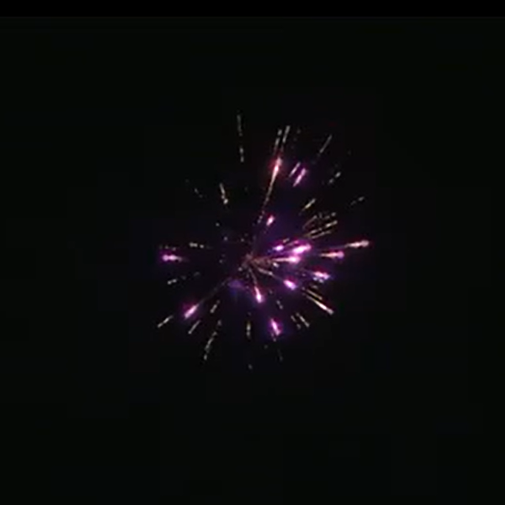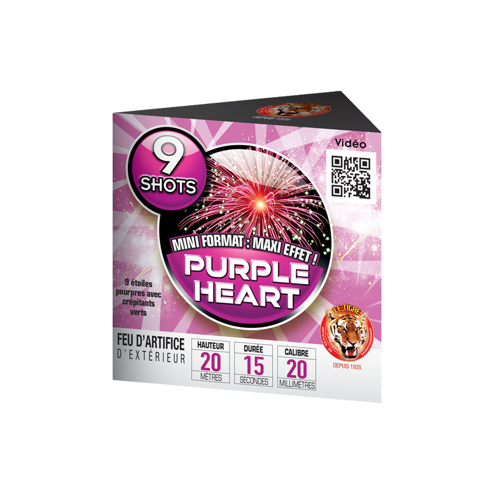 Le Compact 9 Shots “Purple Heart” est un petit format différenciant qui complète parfaitement une offre romantique ou événementielle. Il développe 9 tirs successifs composés d’étoiles pourpres, suivies de crépitants verts, offrant un contraste coloriel original et attractif.