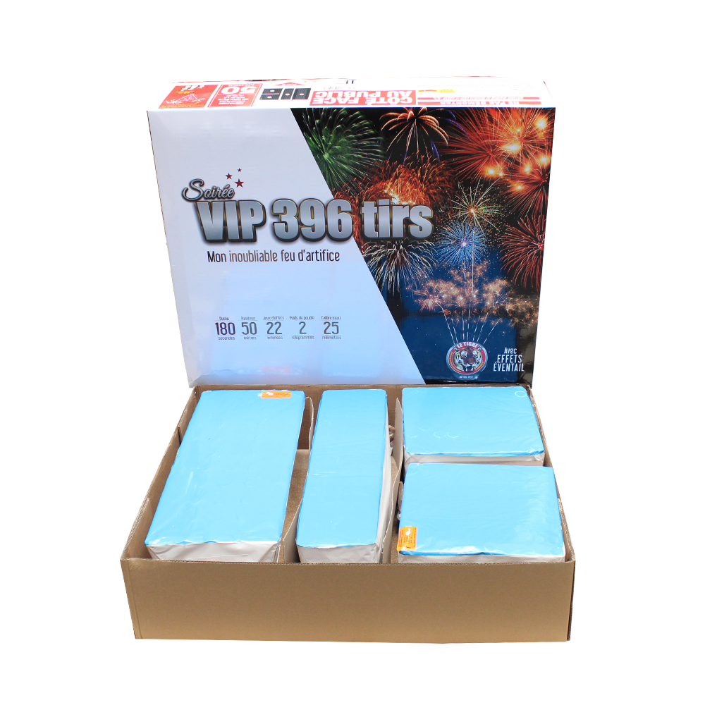Le feu d’artifice Soirée V.I.P. 390 tirs – 4 minutes est le parfait équilibre dans la gamme VIP, conçu pour les professionnels de l’événementiel, comités des fêtes, organisateurs de soirées et revendeurs spécialisés. Il combine intensité et durée avec 390 tirs, moins long que le 434 mais plus intense, moins intense que le 396 mais plus long grâce à son calibre 30 mm, offrant un compromis idéal pour un spectacle haut de gamme.