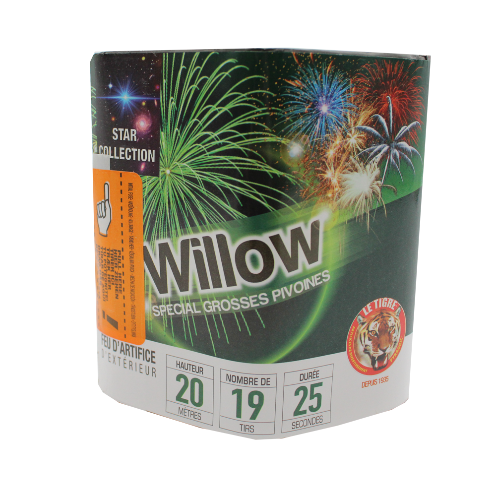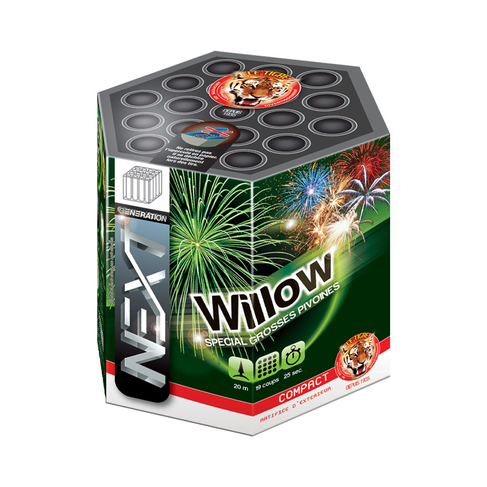 Le Compact 19 Shots “Willow” est un produit idéal pour les professionnels souhaitant proposer un feu d’artifice compact offrant un excellent rendu visuel tout en restant accessible. Ce modèle en calibre 20 mm propose 19 tirs successifs révélant de superbes pivoines colorées qui s’épanouissent dans le ciel avant de se conclure par un bouquet final en pluie crépitante dorée, apportant une touche élégante et lumineuse au spectacle.